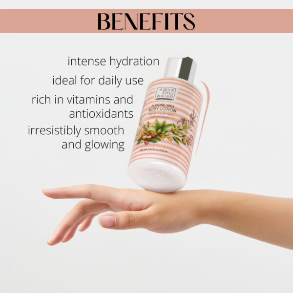 - Nourishing Body Lotion for Deep Hydration Complement your shower experience with the Aqua Shui Body Lotion, formulated to provide deep hydration and nourishment. Enriched with almond oil and shea butter, this lotion is designed to absorb quickly, delivering intense moisture without leaving a greasy residue. Its lightweight texture makes it ideal for daily use, ensuring your skin remains soft and supple throughout the day. The lotion not only moisturizes but also helps improve skin elasticity and texture, giving your skin a healthy, radiant glow.